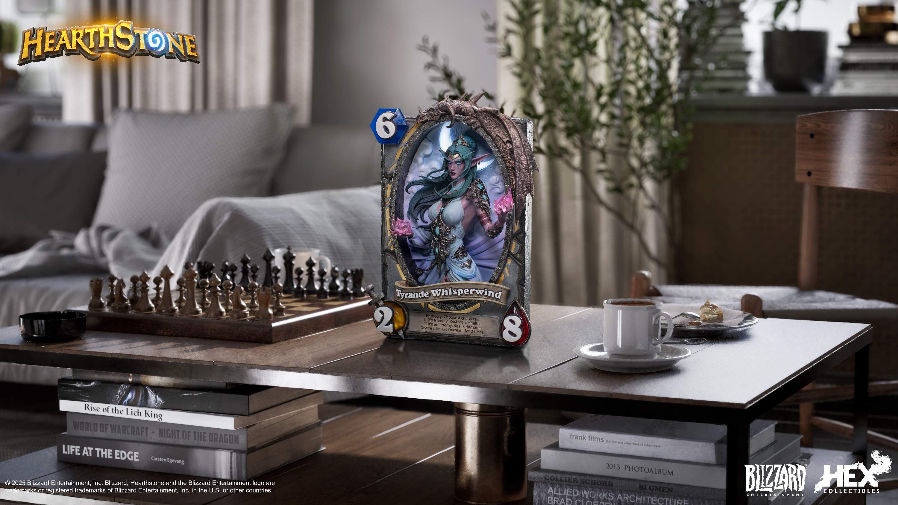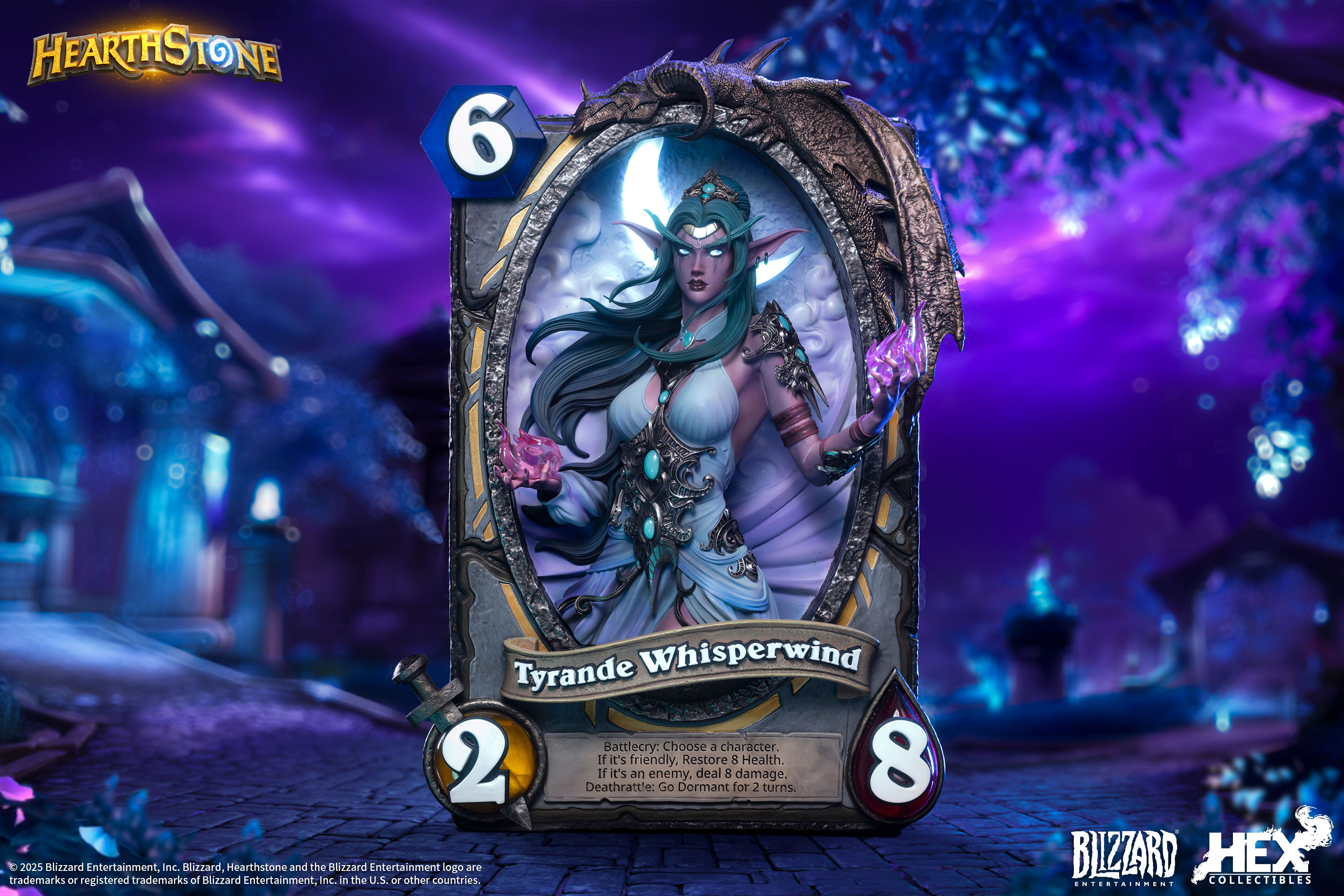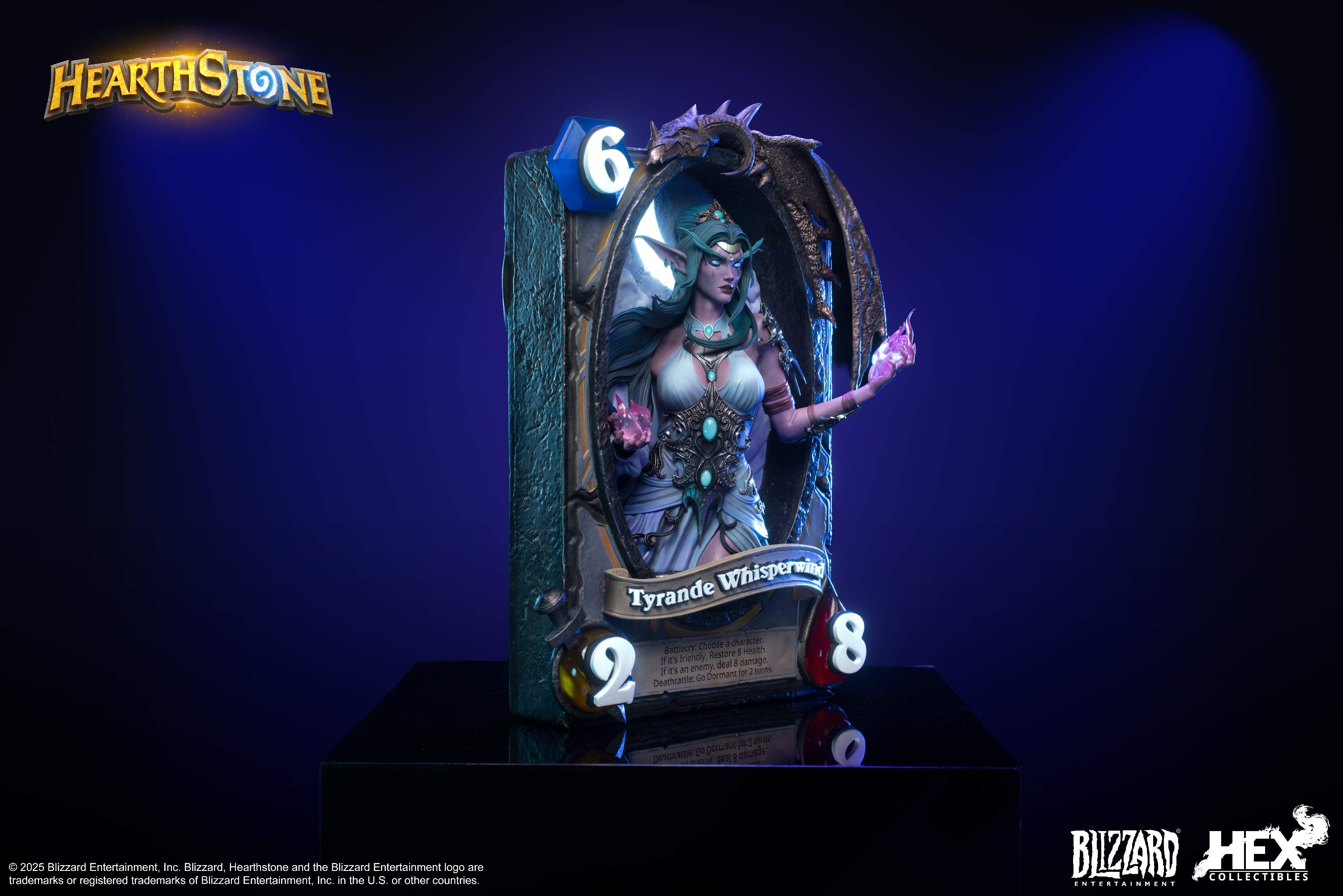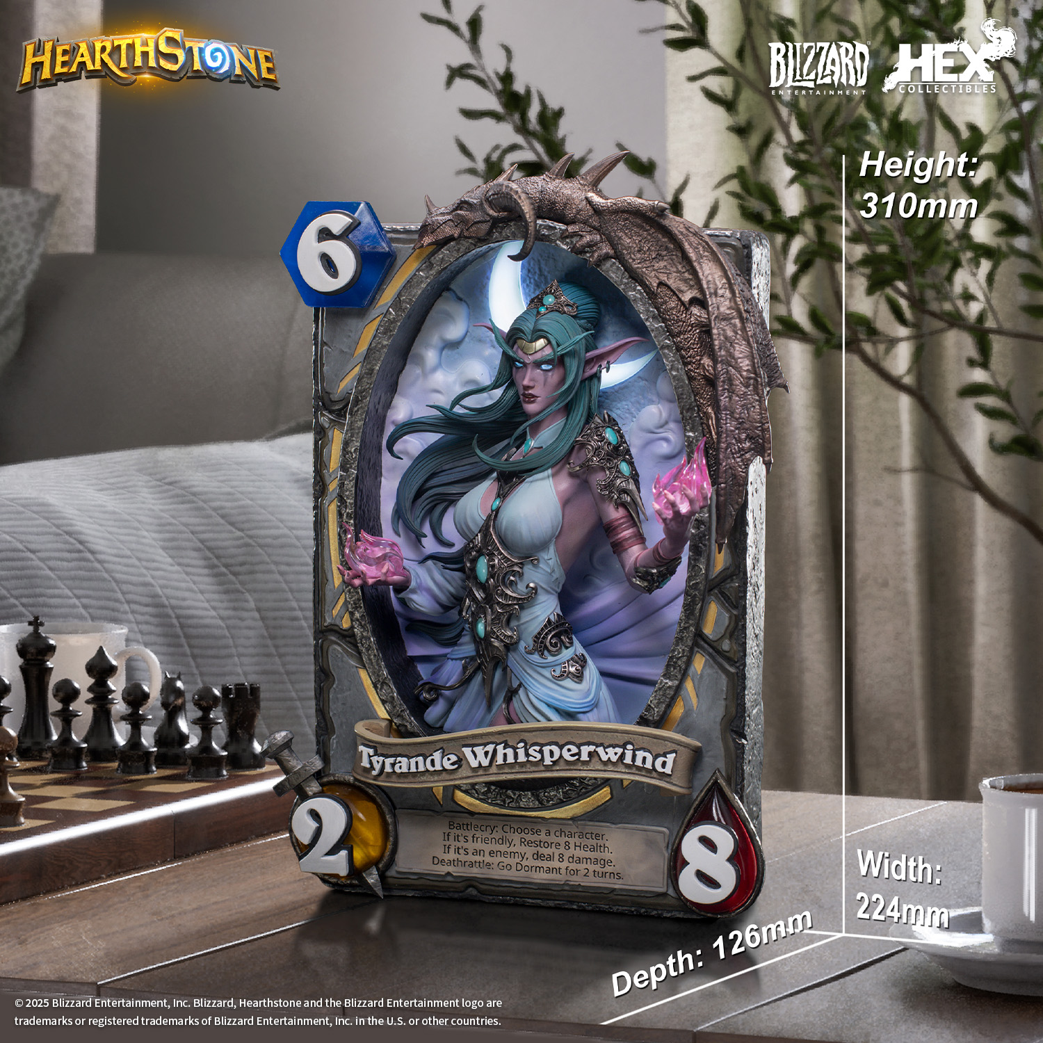 HEX Collectibles and Blizzard Entertainment are thrilled to present the Tyrande Whisperwind art statue, bringing the card from the game into the real world, faithfully recreating the High Priestess of Elune in stunning detail. Based on the minion card from the "Book of Heroes", the statue accurately captures her elegant and solemn posture. Her signature purple skin, flowing aqua green hair, and the jewel-adorned white priestess dress have all been meticulously sculpted and finely painted to reflect her in-game appearance. The statue features built-in LED lighting with two selectable modes: dynamic breathing and continuous illumination, lighting up Tyrande's eyes and the bright moon behind her, bringing the light of Elune to life. Classic elements such as Attack value, Health value, and Rarity adorn the surface of the statue, while the Battlecry is expertly etched at its base, faithfully recreating the original card design. The reverse side recreates the “Tyrande” card back, with the central Hearthstone swirl glowing softly, complementing the ancient, carved stone textures surrounding it. A detachable stand is provided, making it perfect for display on a desk or mounted on a wall. Furthermore, each statue comes with a certificate of authenticity, complete with a handwritten unique number, adding to its collectible value. Just like the brand concept of HEX Collectibles, our team has always looked at ways to push the boundaries of design and capture the essence of each character we love. HEX Collectibles will continue to bring beloved characters to life with our dynamic style of design. Hearthstone® fans, don't miss your chance to add this Tyrande Whisperwind statue to your collection!