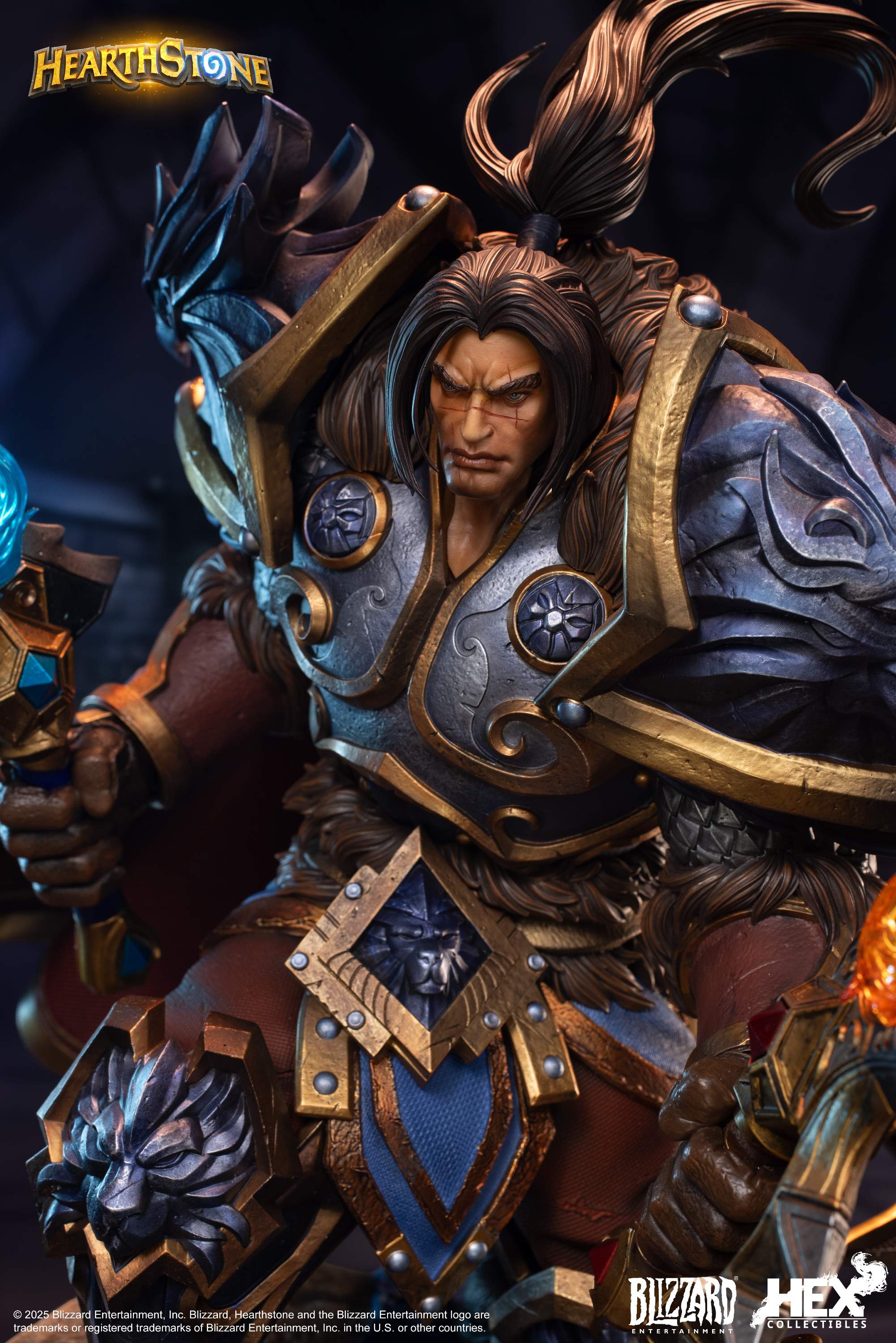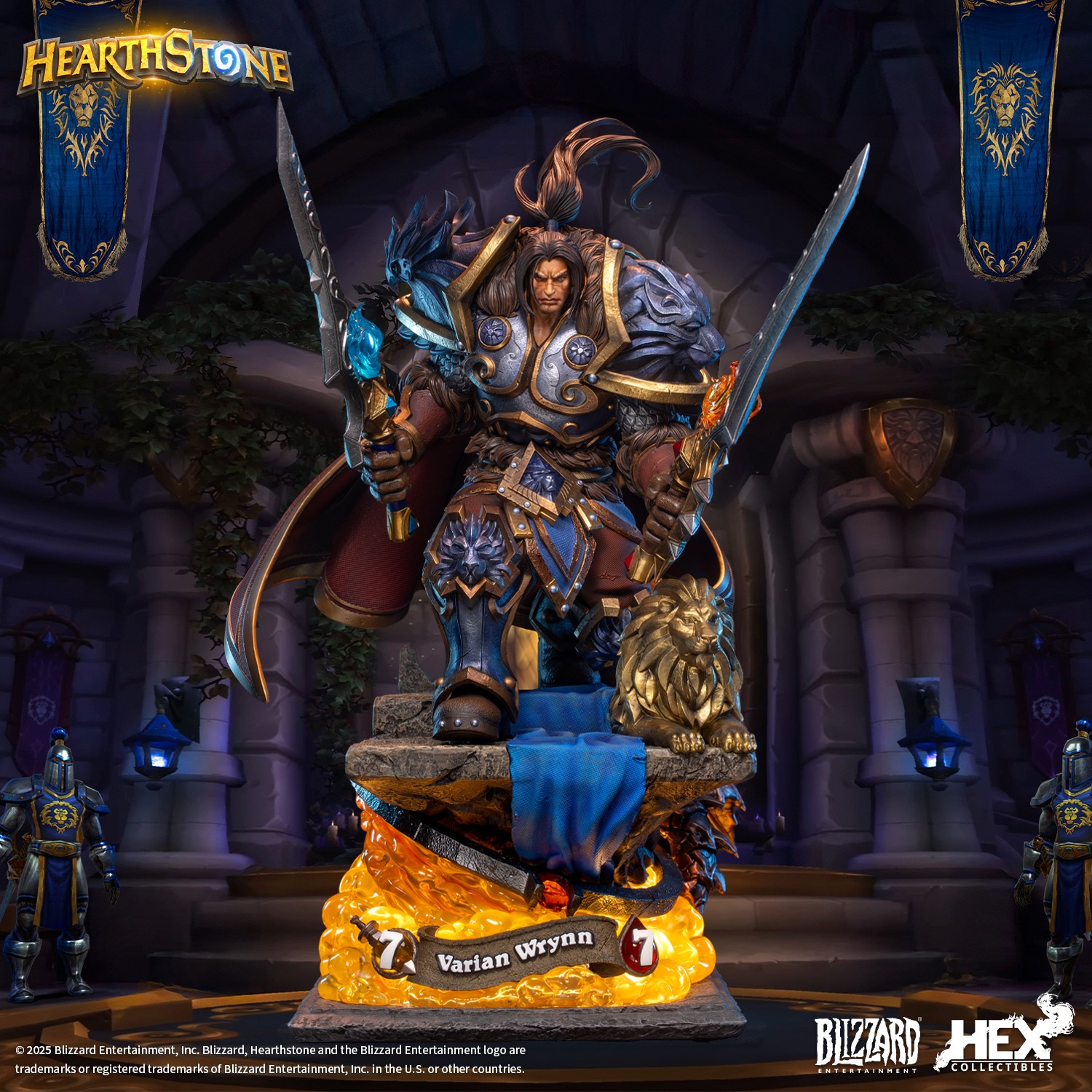 HEX Collectibles携手暴雪游戏倾力打造《炉石传说》瓦里安·乌瑞恩1/6及1/10比例雕像,通过动态写实的雕刻风格,将暴风城国王以立体形象再现! 瓦里安自阶前稳步迈下,目光坚定,气势凛然,尽显王者风范。飘逸的发丝与坚毅的面容皆以高度精细的雕刻忠实再现原画形象。他双手分别握持艾雷迈恩和萨拉托尔,剑身中央采用透明树脂重现标志性的橙色与蓝色光效,剑刃凭借金属渐变涂装尽显传奇武器的锋芒。全身铠甲施以金属质感涂装结合斑驳的战损处理,呈现久经沙场的真实质感;左右肩甲分别饰以雄狮与狮鹫之首,彰显暴风城领袖的无畏意志。 象征暴风城荣耀的皇家蓝色地毯铺陈于阶梯之上,金色雄狮雕像静卧于瓦里安身旁,守望着王室的威严与荣耀。地台内置LED灯效,常亮与呼吸模式自由切换,同时血量、攻击力、橙色宝石等经典元素装点于地台前方,赋予整座雕像宏伟的史诗氛围与收藏属性。 产品配有暴雪官方授权证书,编号唯一且手写,极具收藏价值。 正如HEX Collectibles的品牌理念,我们通过不断创新的方式来突破设计的界限,从而去精准的抓住那些我们挚爱角色的精髓所在。以动态风格著称的设计,继续把我们喜爱的游戏角色带入到大家的现实生活中。 今天就把这款瓦里安雕像加入到你的《炉石传说》收藏吧!
